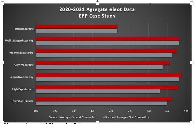 Four completer participants were observed twice using the Effective Learning Environments Observation Tool (eleot®). The chart above displays the comparison between the two classroom observations for each category. The eleot® provides useful, relevant, structured, and quantifiable data on the extent to which students are engaged in activities and/or demonstrate knowledge, attitudes, and/or dispositions that are conducive to effective learning (Source: https://www.advanc-ed.org/eprove/eleot-faq.html).